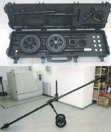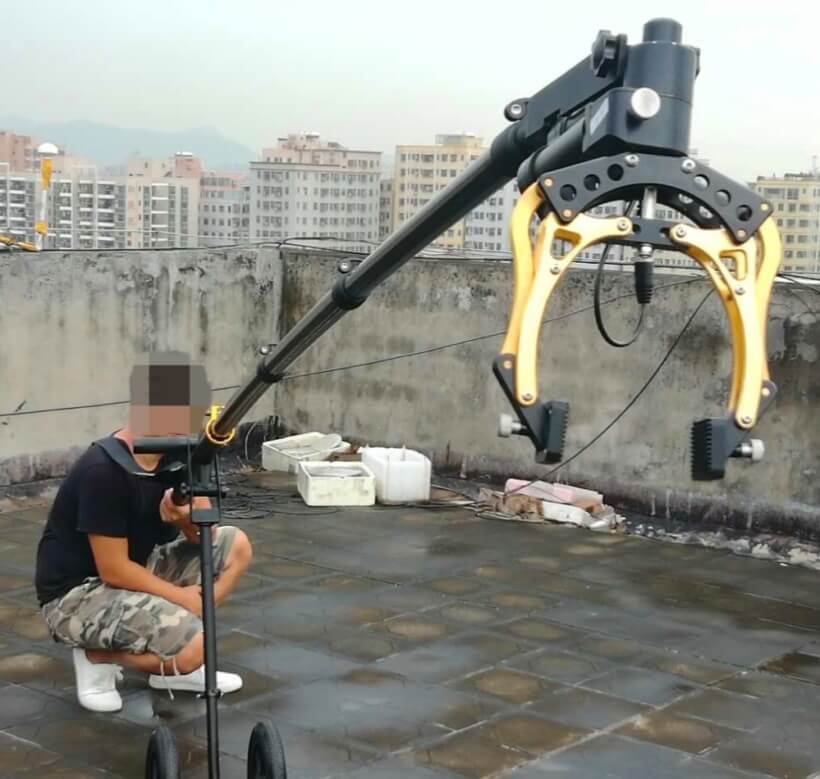 本設備由一個可以雙軸活動的機械手、一個輕質碳纖維伸縮桿和一套減重模塊組成。兩個輪子組成的支點,即可以提升設備的抓起能力,也可以讓設備變得移動方便以及操控方便。
