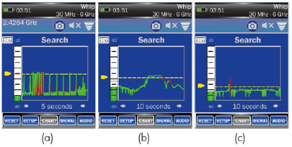 ●ANDRE配有訊號強度直方圖,可以在5秒至12小時范圍內,在用戶選擇的時間間隔里顯示無線電頻率的水平。觀測(a)數字、 (b)模擬和(c)脈沖信號之間的區別,可以設置報警臨界值。